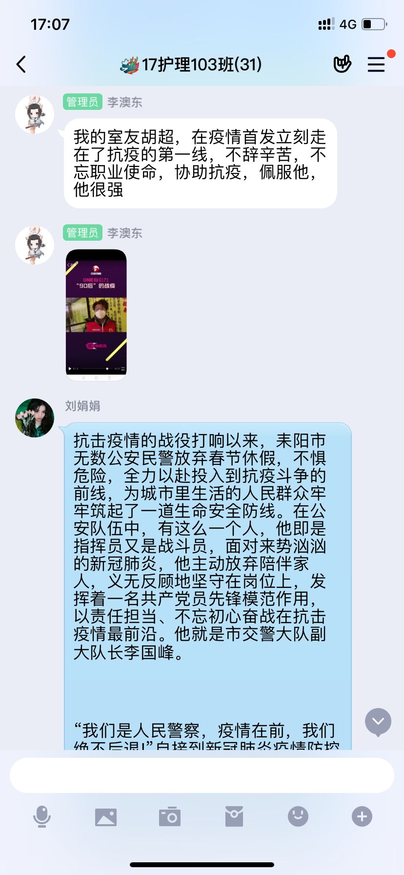 活动中,各支部结合本次团课主题,一起分享抗疫感人故事、感动瞬间和身边案例,一起针对责任担当、家国情怀展开讨论,一起学习习近平总书记回信精神......2018级护理学的杨佳佳同学说,在这场没有硝烟的战争中,涌现出一批批我们叫得出名字的抗疫英雄,还有更多的默默为这张战役奉献的无名英雄,他们都是中国精神和中国力量的体现!我身边的很多同学,在疫情中加入志愿者队伍,奉献自己的绵薄之力,他们的行动,同样让我敬佩!2019级护理学孙威威同跟大家分享说,他的母亲有着出色的裁缝手艺,在疫情中她加入口罩工厂生产大军中,用自己的方式为抗疫做贡献!2017级护理学李澳东同学说,从武汉封城,到火神山、雷神山医院的建成,到一省包一市的对口支援,无一不体现了我们国家的制度优势,身为中国人,我感到无比骄傲和自豪!