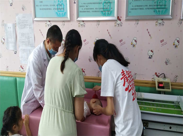 在妇女保健科,实践队员们跟随负责老师进行三月龄妊娠妇女建档立卡,孕期检查指导与注意事项宣教工作;在儿童保健科,主要配合医生,对42天到3岁的小朋友进行儿保体检,测量头围、触诊囟门、心脏听诊、判断肌力、评估听力注意力等。检查过程中,同学们耐心安抚和引导小朋友们配合检查,向家长介绍婴幼儿补充维生素和保持膳食平衡的相关知识。通过老师介绍,大家还了解了国家每年会为适龄婴幼儿提供免费的心脏彩超检查项目。