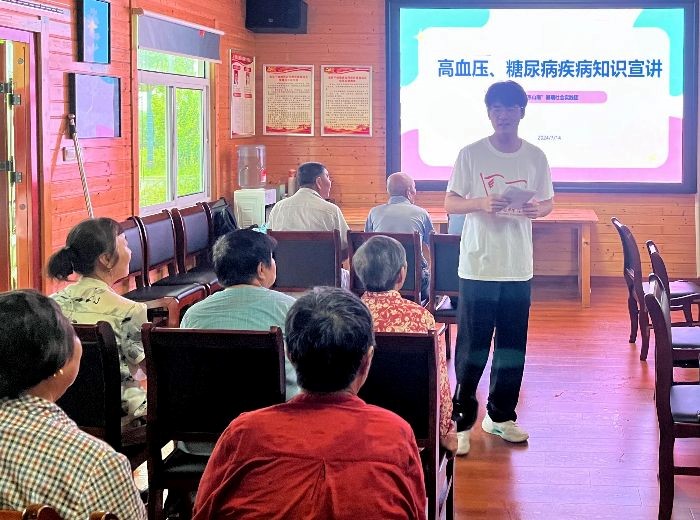 实践团在山南镇开展高血压、糖尿病等慢性病健康宣教活动。同学们用通俗易懂的语言为老人们普及高血压、糖尿病等健康管理知识。宣讲活动结束后,实践团成员免费为老人们测量血压,一一解答老人们的疑惑。