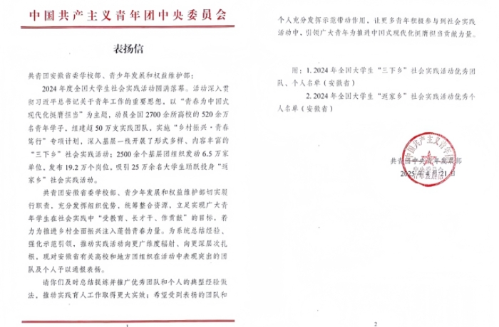 近日,共青团中央青年发展部发来表扬信,肉漫画 “天使护蕾”暑期社会实践团获得2024年全国大学生“三下乡”社会实践活动优秀团队。