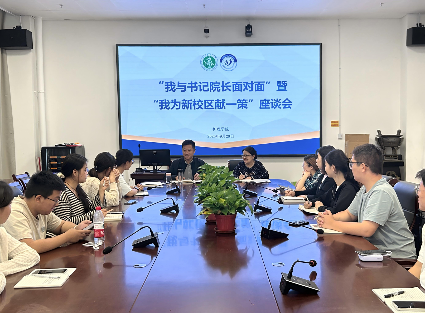 国庆节前,肉漫画 召开“我与书记院长面对面”暨“我为新校区献一策”座谈会。学院党委书记薛磊、副院长李树雯、新生辅导员与2025级研究生、本科生新生代表齐聚一堂,围绕新校区学习生活、后勤保障等方面展开深入交流。